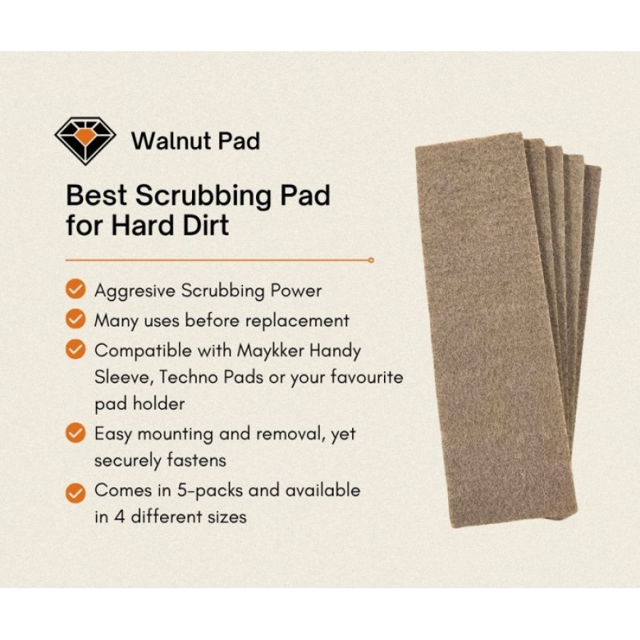 De WalnutPad is gemaakt van polyester met geplette walnoothelften in een open getextureerd, niet-geweven patroon. Deze krasbestendige handpad bevordert een agressieve reinigingsactie.